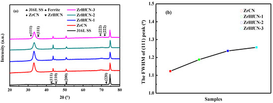 XRD pattern and FWHM of (111) peak of 316L SS and Zr(Hf)xCN coatings. (a) XRD pattern (b) image of FWHM of (111) peak.
