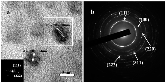 Further details of the microstructure of the ZrHfCN-3 coating were revealed by the HRTEM as shown in Figure 3, and the inset image is the corresponding fast Fourier transformation (FFT) spectrum. Typically, nano-scale (Zr,Hf)CN grains with diameters of 5 nm were found to be surrounded by amorphous matrix. Moreover, both (111) and (222) lattices fringed with lattice spacings of about 0.2618 nm and 0.1304 nm, respectively, were frequently observed. The same region of FFT pattern was indexed into diffraction spots, indicating the single-crystalline nature of the nanoparticles. A selected area electron diffraction (SAED) image (Figure 3b) reveals the crystalline nature of the sample, which was also confirmed by XRD results (Figure 3). The well-defined peaks in the XRD pattern of the Zr(Hf)xCN coatings indicates the high extent of crystallinity for Zr(Hf)xCN coatings with a face-centered cubic structure.