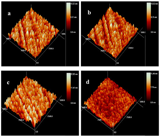 AFM topography images of Zr(Hf)xCN coatings. (a) ZrCN, (b) ZrHfCN−1, (c) ZrHfCN−2, and (d) ZrHfCN−3.