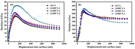 Hardness and Young’s modulus changed with the displacement of Zr(Hf)xCN coatings. (a) Hardness changed with the displacement, (b) Young’s modulus changed with the displacement.