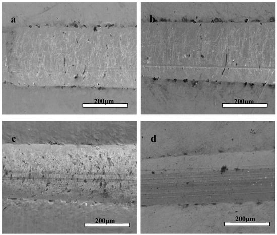 Typical scratch channel images of Zr(Hf)xCN coatings. (a) ZrCN, (b) ZrHfCN−1, (c) ZrHfCN−2, and (d) ZrHfCN−3.