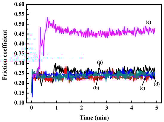 Friction coefficient curves of 316L SS and Zr(Hf)xCN coatings. (a) ZrCN, (b) ZrHfCN−1, (c) ZrHfCN−2, (d) ZrHfCN−3, and (e) 316L SS.