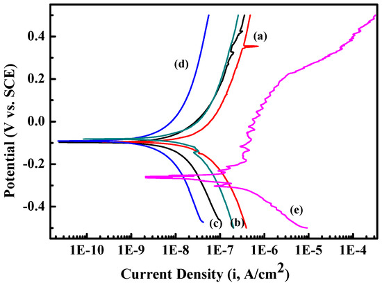 Potentiodynamic polarization curve of 316L SS and Zr(Hf)xCN coatings. (a) ZrCN, (b) ZrHfCN−1, (c) ZrHfCN−2, (d) ZrHfCN−3, and (e) 316L SS.