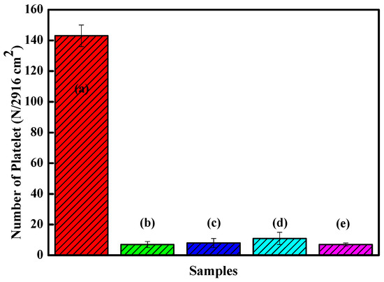 Statistic analysis of the adhered platelet numbers of 316L SS and Zr(Hf)xCN coatings. (a) 316L SS, (b) ZrCN, (c) ZrHfCN−1, (d) ZrHfCN−2, and (e) ZrHfCN−3.