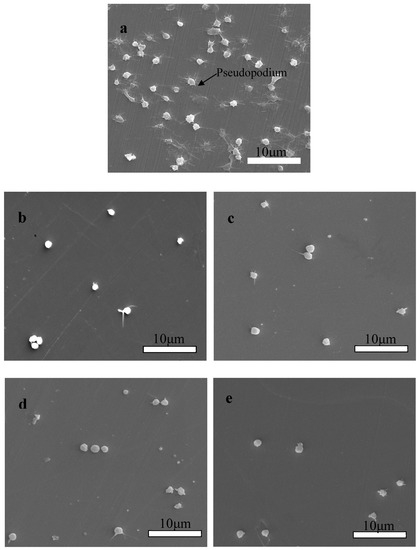 SEM morphologies of platelets adhered on the surface of 316L SS and Zr(Hf)xCN coatings. (a) 316L SS, (b) ZrCN, (c) ZrHfCN−1, (d) ZrHfCN−2, and (e) ZrHfCN−3.