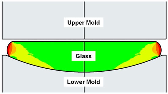 A local stress concentration appears at the first contact between the molds and glass because of the point contact. As shown in Figure 10, the Mises stress peak of about 220 MPa is at the center of the molds. This stress peak is independent of the friction coefficients due to the zero relative velocity in the center and also the same applied load.