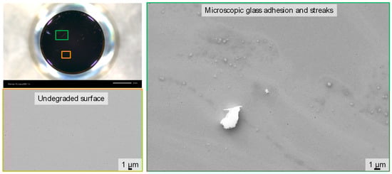 Light microscope images of a DLC-coated lower molding tool from unused before molding up to 500 molding cycles are shown in Figure 5. The large bright circles represent reflections of the light source. Although no surface alterations can be observed after 10 and 50 molding cycles, first surface modification can be seen at the edge of the molding tool after 100 molding cycles. Thus, the protective coating does not fail in the center, where the longest contact time between the molding tool and the heated glass exists, but in the peripheral area, where contact is only achieved during the pressing process. During the following 400 molding cycles, the degradation in the edge area increases further. There is still no degraded surface in the center, as can be demonstrated by SEM analysis (Figure 6). The surface roughness remains less than 5 nm. Opposite to this, microscopic deposits are present at the edge of the mold. EDX measurements proved that these deposits are glass adhesions and streaks of glass components. Glass adhesions have a lateral size of a few micrometers at maximum. Overall, even in the area of glass adhesions, the DLC coating was unbroken after 500 molding cycles. There was no coating delamination to be found.