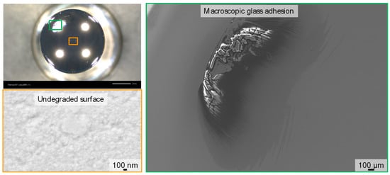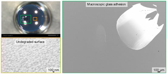 For the PtIr coating, five molding cycles were carried out (Figure 8). Here, glass adhesions can be observed after five molding cycles (Figure 9). In accordance with the observations of the degradation of the DLC and CrAlN protective coatings, the damaged surface was also not observed in the center, but in the edge region. In the center, neither coating degradation nor delamination occurred. The measured surface roughness (Ra) here is still less than 5 nm. The reason for the premature failure of the PtIr coating, deposited with a thin Cr adhesion layer, could be the unstable chemical behavior of this coating system at high temperatures, which was analyzed in a previous study [39]. In this study, diffusion of Cr atoms of the Cr adhesion layer through PtIr columnar grain boundaries to the coating surface was identified as the initial degradation mechanism of this PtIr coating system. The Cr atoms subsequently oxidized at the surface. Therefore, oxidized Cr on the surface may have promoted the formation of the observed glass adhesions, whereas undamaged PtIr coating still behaves chemically inert and does not provide adhesion of glass.