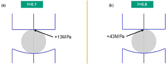 However, a large difference in shear stress at the surface was observed at the first contact (Figure 11). At this point, the maximal shear stress appears in the center of the plan mold. The greater the friction coefficient, the greater the shear stress, which fits Coulomb’s law of friction well. A shear stress of 13 MPa was simulated for a low friction coefficient of 0.1 and a shear stress of 43 MPa for a high friction coefficient of 0.6.