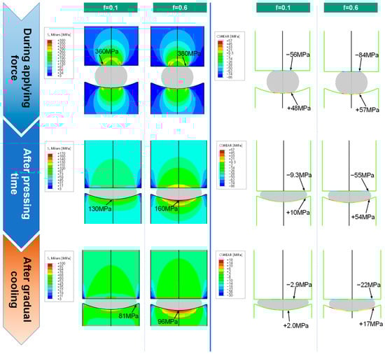 Not only the Mises stress, but also the shear stress is a relevant parameter for analyzing the coating defect formation. Similar to the Mises stress, the shear stress change in the molding and gradual cooling stage is shown in Figure 12 (right). Before the molding force reaches its maximum value (2 kN), the shear stress is similar between the cases with low and high friction coefficients. The fact behind this is that the lower molds move with a defined speed before the rising force reaches its maximum value. Thus, deformation rate and relative slipping speed are independent of the friction coefficient.