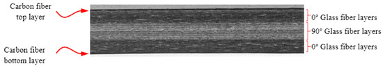 The stacking sequence of the core was [0°13/90°25/0°13] with 25.5% of the glass fiber first part oriented at 0°, 49% at 90° in the middle part, and another 25.5% at 0° for the third part. A cross-section of the material can be observed in Figure 1.
