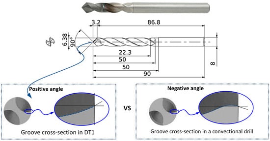 The first tool used was the MCC0638 model, referred to as DT1 (Drill Tool 1) in this study. This tool was a diamond-coated carbide tool manufactured using Chemical Vapor Deposition (CVD) techniques. It featured a geometry specifically designed for drilling CFRP and CFRTP (Carbon Fiber Reinforced Thermo-Plastics) materials. The cutting-edge rake angle was strengthened in the vertical direction along the rotation axis. Additionally, at its outermost periphery, the cutting-edge rake angle maintained a positive angle, in contrast to the negative angles commonly found in conventional drills. An image of the whole geometry is presented in Figure 2.