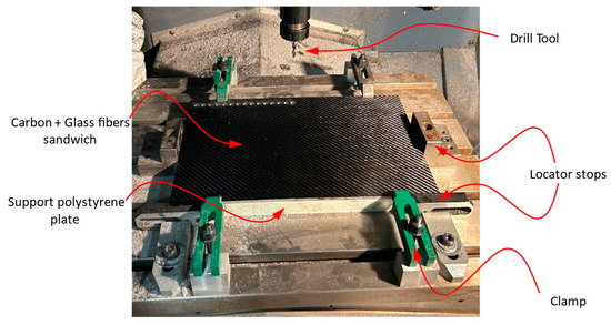 The sandwich plates are securely fastened to the worktable using four clamps and four locator stops, as depicted in Figure 4. The bottom face of each sandwich plate is sup-ported on an extruded polystyrene plate. This polystyrene plate includes a complete matrix of predrilled holes placed in the same positions as the holes to be drilled in the sandwich plate. Its purpose is to function as a backing plate, preventing displacements and deformations in the primary plates and minimizing delamination at the exit points.