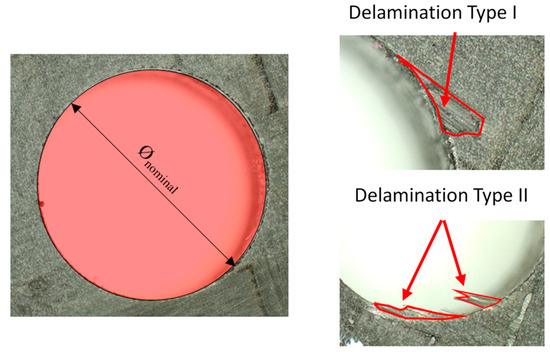Nominal area of the hole and some examples of delamination type I (area marked in red) and type II (area marked in red) measurement.