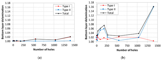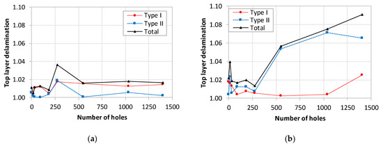 The results of the delamination factor at the hole entry (Peel-up delamination) are presented in Figure 10. In the graphic, the damage has been quantified as delamination type I or II, following the previously mentioned definitions, just like the sum of both.