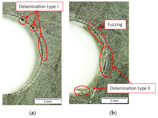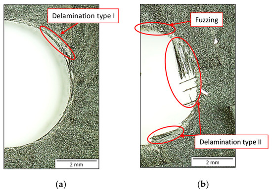 Damage inspection was conducted on the outer layers of the drilled sandwich plates to evaluate the extent of machining-induced damage. The dimensions of delamination damage are measured using software integrated with an optical microscope (Evident, Tokyo, Japan). The software automatically calculates the area value of a closed line selected by the user. Delamination type I appears when the fibers are bent into the machining line, causing surface damage to the part. Delamination type II occurs when fibers protrude from the machined edge [58]. An example of both delaminations is shown in Figure 5. As depicted in this image, a good-quality image is obtained from the microscope, facilitating the quantification the two possible types of delamination.