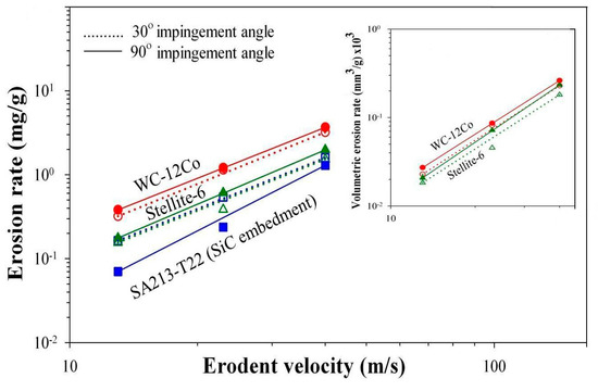 - The velocity exponent indicates erosion sensitivity. In the case of uncoated SA213-T22 steel with SiC embedment, the change in velocity exponent from 2.3 to a value exceeding 3 showed a drastic change in the surface condition, while the Stellite-6 and WC-12Co coatings had values of 2, which corresponded to the traditional literature [3,27,42].