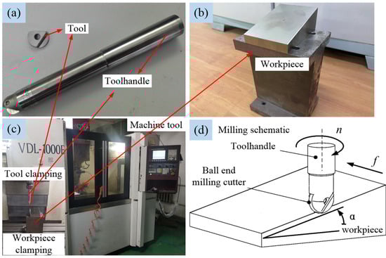 Experimental materials. (a) Tool, (b) Workpiece, (c) Testing site, (d) Milling method. n: Tool rotation direction, f: feed direction.