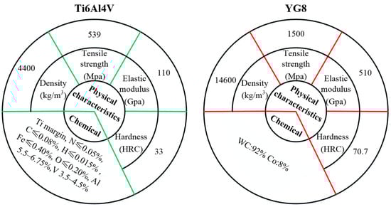 The cutter blade model is BNM-200 (BNM-200 produced by Xiamen Golden Egret Special Alloy Co., Ltd., Xiamen, China), the tool material is cemented carbide, the brand is YG8 (YG8 tool produced by Xiamen Golden Egret Special Alloy Co., Ltd., Xiamen, China), there is no coating, the rake angle is zero, and the toolholder is cemented carbide with a size of Φ20 × 141 mm, as shown in Figure 1a. The titanium alloy material with a workpiece grade of TC4 used in the test is shown in Figure 1b, and the relevant physical and chemical parameters of these materials are shown in Figure 2. A VDL-1000 E (VDL-1000E produced by Dalian Machine Tool Factory, Dalian, China) three-axis vertical milling machine was selected as the machine tool, and is shown in Figure 1c. The clamping method of the titanium alloy workpiece includes an angle between the surface to be machined and the horizontal plane of the machine tool guide rail of 15°, as shown in Figure 1d. Considering the advantages of down milling, such as stable milling, high surface quality, and slow tool wear, the down milling method was chosen. Before and after the test, the surface morphology of the tool was photographed using a super depth of field microscope (produced by Pinzhi Chuangsi Precision Instrument Co., Ltd., Beijing, China).