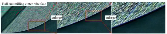 In order to verify the strength analysis of the blunt-edge micro-texture ball-end milling cutter described above, the 10th and 16th sets of tool parameters with the highest stress and strain were selected to complete the preparation of the blunt-edge and uniform-density micro-texture of the ball-end milling cutter. The results are shown in Figure 22. Cutting experiments are conducted using the prepared tool to verify the usability of the tool. The cutting parameters are selected as ap = 0.5 mm, f = 0.1 mm/r, and v = 140 m/min. Milling force, tool wear, and surface roughness data are collected. A control group is added, and the experimental results are shown in Table 7.