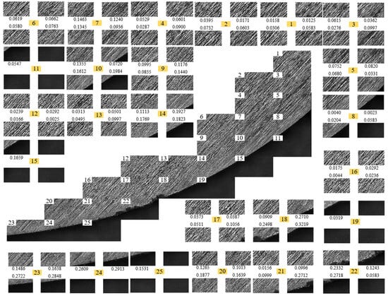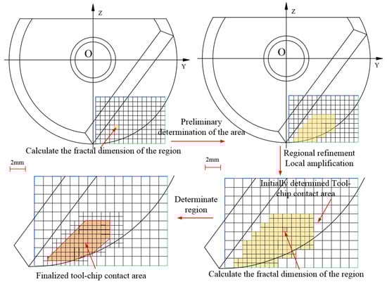 There are differences in surface morphology before and after tool use. In order to eliminate this error, the difference between the fractal dimensions before and after the use of the tool is obtained as the tool wear result, and is then further analyzed. The processing is shown in Figure 4. The sample tool 1 is taken as an example in order to explain the results. Using MATLAB programming, the division of the tool area and the calculation of the box dimensions are realized. In the initial calculation, the picture is divided into 100 equal parts to determine the box dimensions of each part. It should be noted that when the rake face of the tool is photographed, other areas of the tool will be photographed, which will interfere with the calculation results. Therefore, the results of the interference area need to be eliminated when calculating the average. When the box dimensions are larger [29], the rougher the tool surface, the more serious the wear. The initially determined tool–chip contact area is shown in Figure 5.