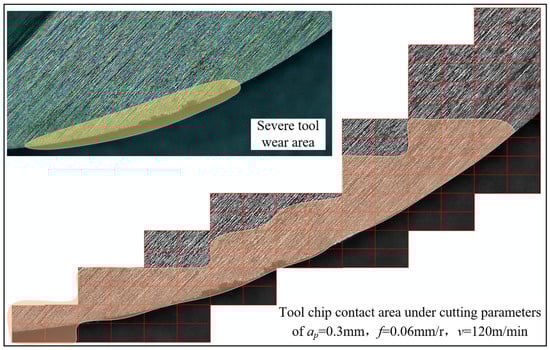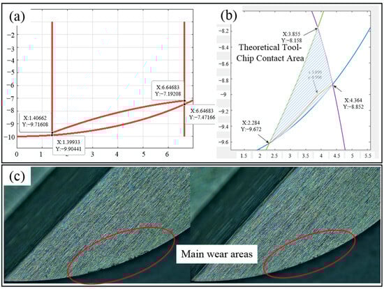 In order to verify the accuracy of the tool–chip contact area (as shown in Figure 12a) derived based on fractal theory, it is compared with the tool–chip contact area (as shown in Figure 13b) derived by the team based on the geometric modeling of cutting and chip curl theory in the earlier stage [30]. In combination with the actual wear image, it can be found that the former is closer to the actual wear results, indicating that it is more effective and accurate.