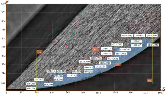 In order to establish the micro-texture distribution model of the ball-end milling cutter, a rectangular plane coordinate system is established with the tool tip as the origin, the cutting-edge tangent as the X-axis direction, the vertical cutting direction as the Y-axis direction, and the image segmentation size as the coordinate scale. The curve is fitted to solve the tool–chip contact area equation. A schematic diagram is shown in Figure 8.