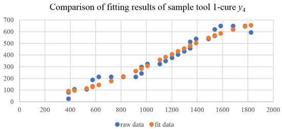 According to Figure 8, the curve of the tool–chip contact area is mainly composed of four curves. Curves y1 and y2 are x1 = 384, x2 = 1828, curve y3 is a circle passing through the origin (0,0) and the point (384,27), curve y4 is a curve surrounded by the above-marked points. Data fitting is performed for curve y4, and the fitting equation is shown in Equation (1). Significance test: R2 is 0.963, F statistic is 209, p value is 2.5 × 10−27. It is proved that the fitting equation is significant, and the results are shown in Figure 9.
