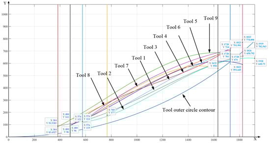 The same treatment was performed on the nine tools in the experiment to obtain the corresponding tool–chip contact area equation. The equation solved is as follows (the arc contour curve equation of the tool is the same as that of tool 1, and the following equation is not given):