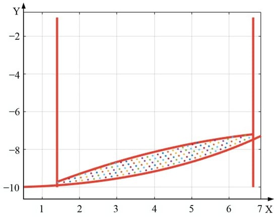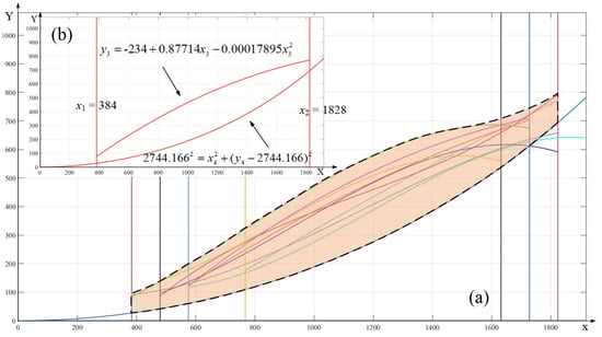 In order to ensure that the micro-textured tool is able to give full play to the anti-wear and anti-friction effect when finishing titanium alloy, the union of the tool–chip contact area is selected for micro-texture placement under different cutting parameters. The results of the determination of the tool–chip contact area after union are shown in Figure 12a. Then, the curve formed by the union is fit. The results are determined using Equation (3). The final tool–chip contact area is shown in Figure 12b.
