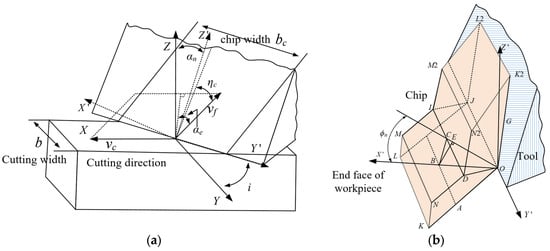 Three-element cutting: (a) three-dimensional cutting coordinate relationships; (b) three-dimensional cutting geometric relationships.
