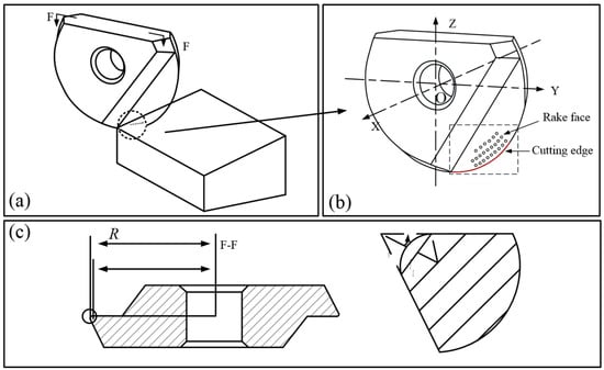 Due to the strong chemical activity of titanium alloys, problems such as high milling force, high milling temperature and serious tool wear can easily arise during milling [1]. Studies have shown that the placement of micro-texture can effectively improve the anti-wear and anti-friction performance of the tool and improve the efficiency and quality of cutting. At present, most of the research on micro-textured tools is related to the following aspects: (1) the cutting performance of micro-textured tools; (2) the placement area and distribution form of micro-texture; (3) optimization of micro-texture parameters; (4) the preparation process for tool micro-texture; (5) the synergistic effect of the micro-texture and the cutting edge; and (6) the combination of micro-texture and coatings [2,3,4]. A study of the placement area and distribution form of micro-texture can serve as the basis for discussing the effectiveness of micro-texture tools. Rational placement and design are the premise for the role played by the micro-texture. In precision machining, a shallow cutting depth and a low feed rate, as well as a high cutting speed, are usually chosen to ensure precision. The main cutting is completed by the cutting edge and the tool surface near the edge. Severe wear usually occurs at the cutting edge and in nearby areas, resulting in poor surface quality of the workpiece. Therefore, passivation treatment of the tool edge can effectively improve the tool life and the stability of the cutting process, while also improving the cutting performance of the tool. It is necessary to study the micro-textured tool under the action of the cutting edge.