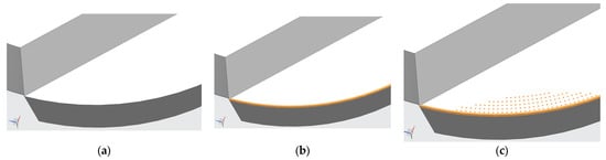 A three-dimensional model of the ball-end milling cutter is established in UG 10.0 (Unigraphics NX, Interactive CAD/CAM System). The tool material is cemented carbide, the front angle is 8°, the back angle is 11°, and the tool diameter is 20 mm. Considering the time required for the simulation calculation, only the blade part is simulated on the rake face of the ball-end milling cutter. It is also necessary to chamfer the cutting edge of the ball-end milling cutter. The three-dimensional model of the ball-end milling cutter is shown in Figure 18. Furthermore, the ANSYS 16.0 (computer-aided engineering (CAE) software, for performing finite element analysis) Workbench is used to simulate the force of the blade and the load condition of the micro-pit texture in the contact area of the ball-end milling cutter.