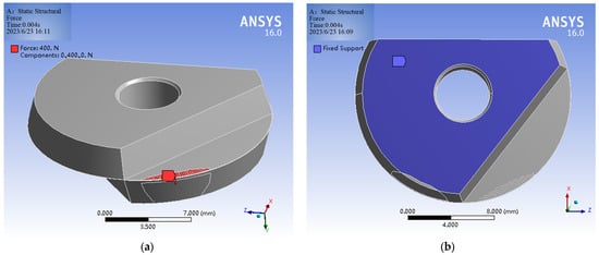 Due to the static simulation performed using ANSYS, it is impossible to simulate the motion state of a workpiece milled using micro-texture tools. Therefore, a certain load is applied to the blade to simulate the working conditions. Considering the complexity of the force under actual working conditions, the force is simplified into three forms: one is to apply a concentrated load at the tooltip; the second is to apply linear load at the cutting edge position of the main and auxiliary cutting tools; the third is to apply surface load on the front and rear surfaces of the tool. The milling force is regarded as a linear surface load, which fluctuates in a sinusoidal function with time. The tool–chip contact area is the main area of cutting force and friction heat generation, so the micro-texture is placed in this position. The applied position of the load should also be the tool–chip contact area, that is, the area prepared for micro-texture, where a linear surface load is applied. In addition, constraints are set on the bottom of the tool, as shown in Figure 20.