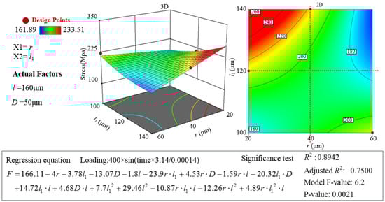 The response surface methodology is used to analyze its influence law using Design Expert 13 software. Using the blunt radius, micro-texture diameter, distance from the edge, and micro-texture spacing as independent variables, and the stress value as the dependent variable, the response surface equation is established as follows: