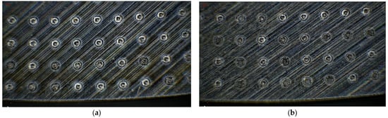 Preparation results of the blunt round-edge and micro-texture of the ball-end milling cutter. (a) Sample 10; (b) Sample 16.
