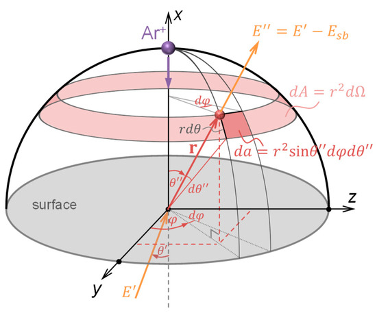 For isotropic sputtering, the solid angle ω (related to the area da in Figure 2) can be replaced by the solid angle integrated over the azimuth Ω (related to the area dA in Figure 2). The angular EDF can be then written as: