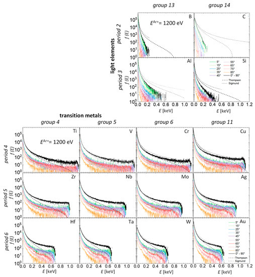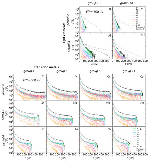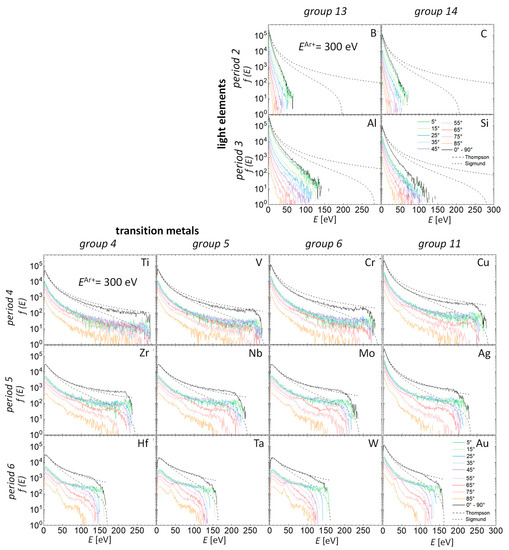 The total and angular EDFs for Ar ions impinging with 300 eV, 600 eV and 1200 eV are shown in Figure 4, Figure 5 and Figure 6, respectively. The black lines represent the total EDFs and the colored ones the angular EDFs. The angular EDFs are shown for atoms sputtered in 10° intervals (e.g., the interval between 0° and 10° is denoted as 5°). The graphs are arranged in a similar order as the elements in the periodic table. We also fitted the simulated distributions to the analytical equations for the total EDF derived by Thompson and Sigmund. These two analytical equations are discussed in more detail in Section 4. The dashed black line in the graphs shows the fit using the Thompson EDF [32] and the dotted black line using the Sigmund EDF fitted to simulated total EDFs. When fitting Sigmund and Thompson EDFs to the simulated ones, the normalization factors (AT and AS) and the power parameter in the functions were free parameters (see Section 4.1.1).