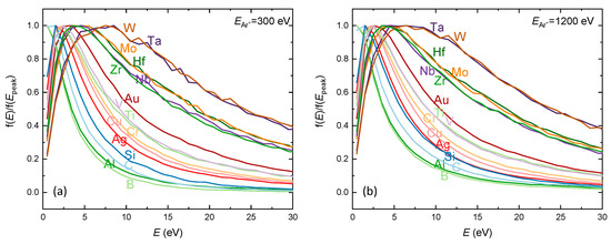 All total EDFs presented in Figure 4, Figure 5 and Figure 6 exhibit a low-energy peak, positioned at approximately Esb/2 and a high-energy tail decreasing as E−2. In order to compare the position of the low-energy peak and FWHMs for EDFs of different elements, we normalized the total EDFs for sputtering with 300 eV and 1200 eV Ar ions (Figure 7). The EDFs for selected materials show the same shape of EDF at 300 eV and 1200 eV, and therefore we do not present the EDFs for sputtering with 600 eV ions. Hence, the general shape of the total EDFs according to SRIM simulations (and also Sigmund and Thompson EDFs) does not change with the ion energy. The light elements in groups 13 and 14 (B, C, Al, Si) show sharper low-energy peaks than the transition elements.