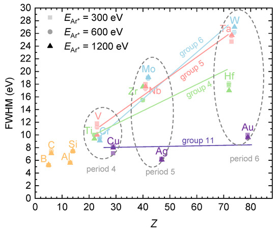 Full width at half maximum (FWHM) as a function ofthe atomic number. Elements in the same group are colored with the same color, and with different shades and symbols for different energies (300 eV, 600 eV and 1200 eV Ar ions).