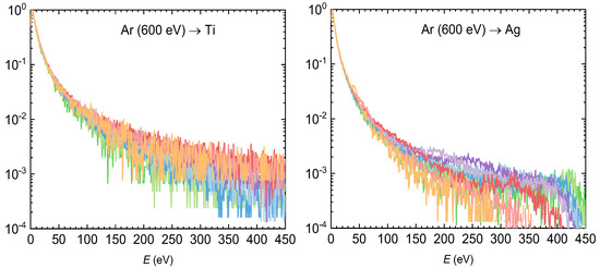 The angular EDFs obtained from SRIM simulations are shown in Figure 4, Figure 5 and Figure 6 in colored lines, while the total EDFs are shown in black lines. In general, the shape of angular EDFs is similar to the total EDFs, although with several noticeable differences. The number of atoms at the peak position of the angular EDFs decreases with the polar emission angle. Most atoms are sputtered close to the normal direction, which was already observed in our study of differential sputtering yields (see Figure 5 in [36]). The high-energy tail decreases similarly for all emission angles, which is demonstrated in Figure 10, where angular EDFs normalized to the low-energy peak are shown for sputtered Ti and Ag atoms.