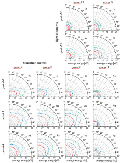 Figure 12 presents the polar distribution of average energies for the investigated elements. The simulations were made for perpendicular Ar ion impingement with energies of 300 eV, 600 eV and 1200 eV. The shapes of the distribution are similar, regardless of the ion energy. The elements in period 4 and groups 4–6 (i.e., Ti, V, Cr) have the most directed distribution, with the highest average energies near the 65° emission angle. The elements in period 5 and groups 4–6 (i.e., Zr, Nb, Mo) have a somewhat less-directed distribution, with the highest average energies around the 55° angle. In period 6, the elements in groups 4–6 (i.e., Hf, Ta, W) have a more isotropic distribution of the average energy than in periods 4 and 5. Slightly higher average energies of sputtered atoms are found near the 45° emission angle. The shape of the polar distribution for elements in groups 11 (i.e., Cu, Ag, Au) also changes with the period—a more anisotropic distribution is visible for Cu (period 4) and the most isotropic distribution (close to circular) for Au (period 6). In general, the elements in group 11 have more isotropic distribution compared to elements in the groups 4–6. Furthermore, the heaviest elements show the most isotropic distributions for the angular average energies.