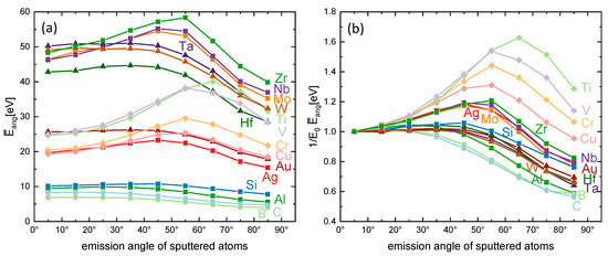 The average energy of sputtered atoms depends on the emission angle of sputtered atoms, as demonstrated in Figure 12 and Figure 13a. For transition metals, the average energies increase with the angle and reach the highest values at approximately 40°–70°, depending on the target material. The angular average energies obtained from SRIM simulations can be compared to the measured average energies from the literature. Lautenschläger et al. [17] measured angular EDFs for Ti bombarded by Ar ions with 1 keV at normal incidence using ion beam sputtering, which is also discussed in [40]. The authors measured an average energy of 26 eV at 60° emission angle, 32 eV at 70°, and 56 eV at 80°. These energies somewhat deviate from the energies from SRIM simulations obtained in this work. For Ar ion bombardment of Ti with the energy of 1.2 keV, the SRIM simulations give 40 eV at 65°, 37 eV at 75°, and 32 eV at 85°.