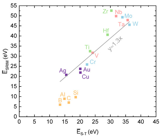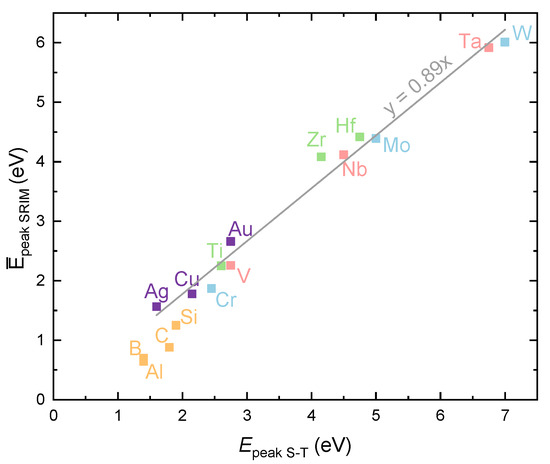 Figure 17 shows a comparison between the average energies from SRIM simulations and the average energies calculated from Equation (15). In general, the average energies obtained by SRIM are higher than the analytically calculated average energies. The linear function that best fits the data is . Hence, the average energies obtained from SRIM simulations are approximately 30% higher than the theoretically predicted ones. The largest difference is observed for Zr and Nb. The accuracy of theoretical and simulated total average energies could be verified by comparing the data with the measurements from the literature. However, experimentally measured average energies are measured only in specific spatial directions, and should therefore be compared to the angular average energies. This is discussed in the next section.