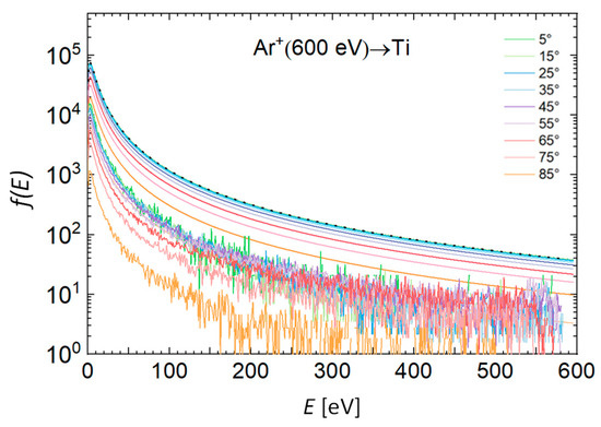 The angular EDFs were obtained by analyzing the energies of atoms sputtered into a particular spatial region. The 10° polar angle intervals were selected for the evaluation; therefore, we present EDFs at the mean values of polar angles (i.e., 5°, 15°, 25°, etc.).