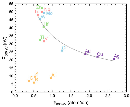 If the total average energy of sputtered atoms is plotted as a function of the total sputtering yield, then an inverse correlation can be observed for the transition metals (Figure 18). To our knowledge, in the literature there is no theoretical expression that would correlate the average energy of sputtered atoms to the sputtering yield, and therefore we provide an empirical equation that best fits our data. The average energies with dependence on sputtering yield show similar trends for sputtering with ions in the 300–1200 eV range. For the transition metals, the relation between the total average energy of sputtered atoms and the sputtering yield can be fitted to a simple function: