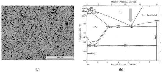 Cast iron with lamellar graphite. (a) Form of lamellar graphite. (b) Iron–carbon phase diagram and eutectic point (adapted) [13].