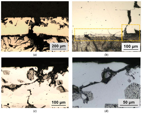 Figure 5 shows the effect of laser treatment in DZ1 for combination 2. The graphite is influenced by the laser beam, which later leads to the formation of cracks. This phenomenon was observed in all samples. After etching, decarburization of the substrate was detected, as shown in Figure 5b. Where a graphite network existed, the graphite was compressed during laser beam processing. This is probably due to the difference in thermal expansion behavior between the matrix and the graphite lamellar and is a reason for the pressing or squeezing of the graphite. Due to the partially tightly arranged sharp-edged TiC particles, the formation of long cracks was heightened, as can be seen in Figure 5c,d.