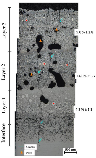 Collage showing the OM micrographs of the cross-section of the sample in the as-built condition. The different zones detected by optical microscopy are labeled on the left side of the image as “Interface”, “Layer 1”, “Layer 2”, and “Layer 3”, whereas the mean porosity ± standard deviation in each layer was reported on the right side of the collage. The red dots indicate some residual unmelted WC powder regions, while the orange rectangles highlight porosities. Finally, the blue arrows depict some cracks.