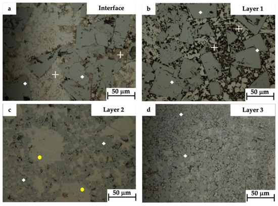 OM micrographs of the cross-section of the sample in the as-built condition showing the microstructure observed (a) at the Interface, (b) in Layer 1, (c) in Layer 2, and (d) in Layer 3. The white diamonds in Figure 5a–d indicate the WC grains, whereas the white crosses in Figure 5a,b highlight the eutectic carbides with herringbone morphology. Finally, the yellow dots in Figure 5c depict some residual unmelted WC powder regions.